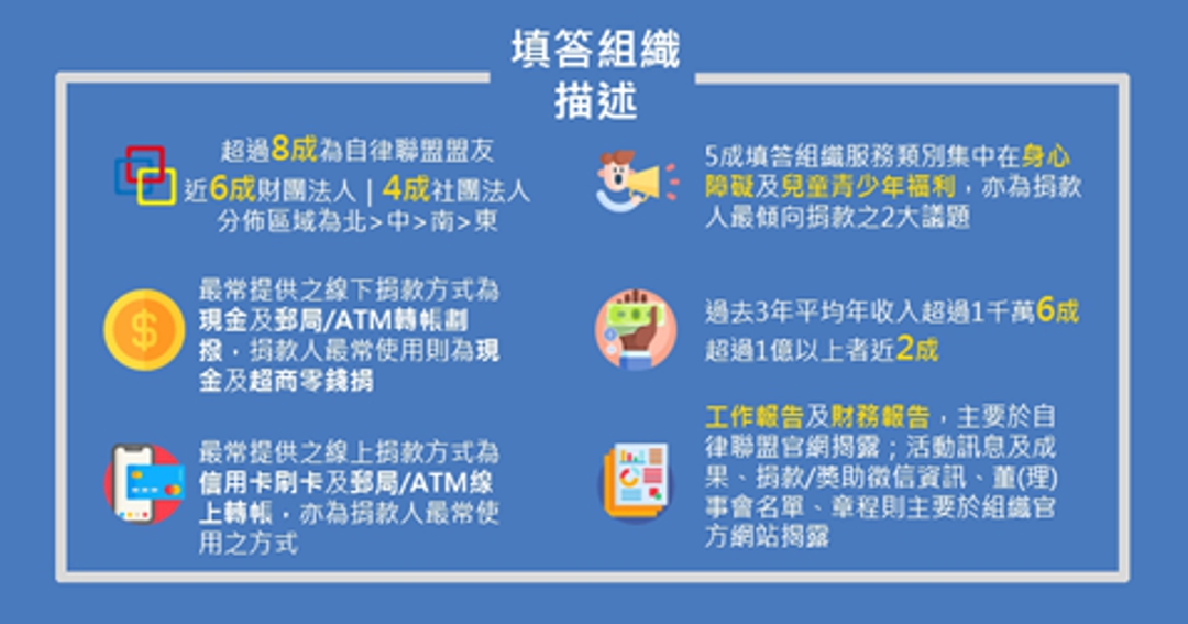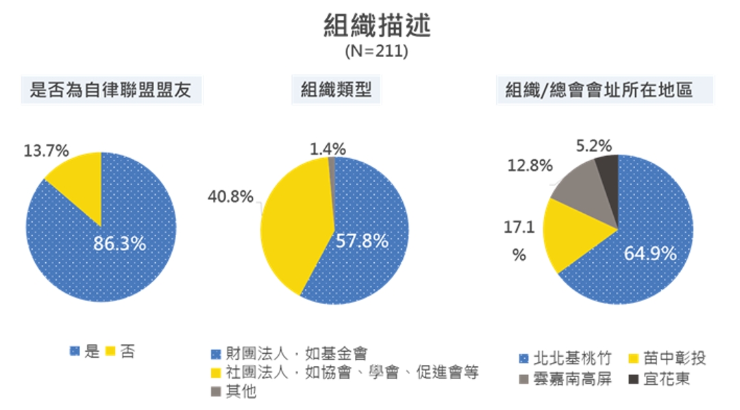 本研究回收之有效問卷計211份,其中超過8成5為自律聯盟盟友,組織所在地區分佈北中南東,以超過6成的北北基桃竹為多。最常見的服務類別前三大分別為身心障礙福利(29.9%)、兒童青少年服務(20.4%),以及綜合性服務(17.1%)。約6成為財團法人,全職給薪人數以4-10人為多,兼職給薪人數多為1-2人,近9成的單位設有常態性志工。組織規模含括小型、中小型、中型、中大型及大型組織,最常見之規模為超過逾2成之1001-3000萬。約9成組織利用線上/網路管道接受捐款,最常見的管道為郵局或銀行線上轉帳、其次為線上信用卡刷卡,皆占8成以上;另則有超過9成8的組織提供線下/實體管道,包含現金、郵局/銀行ATM轉帳或劃撥等,皆占9成以上。