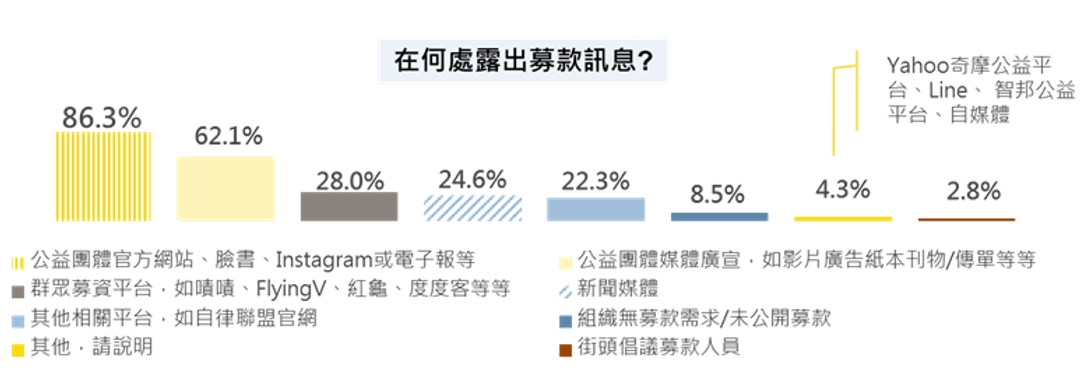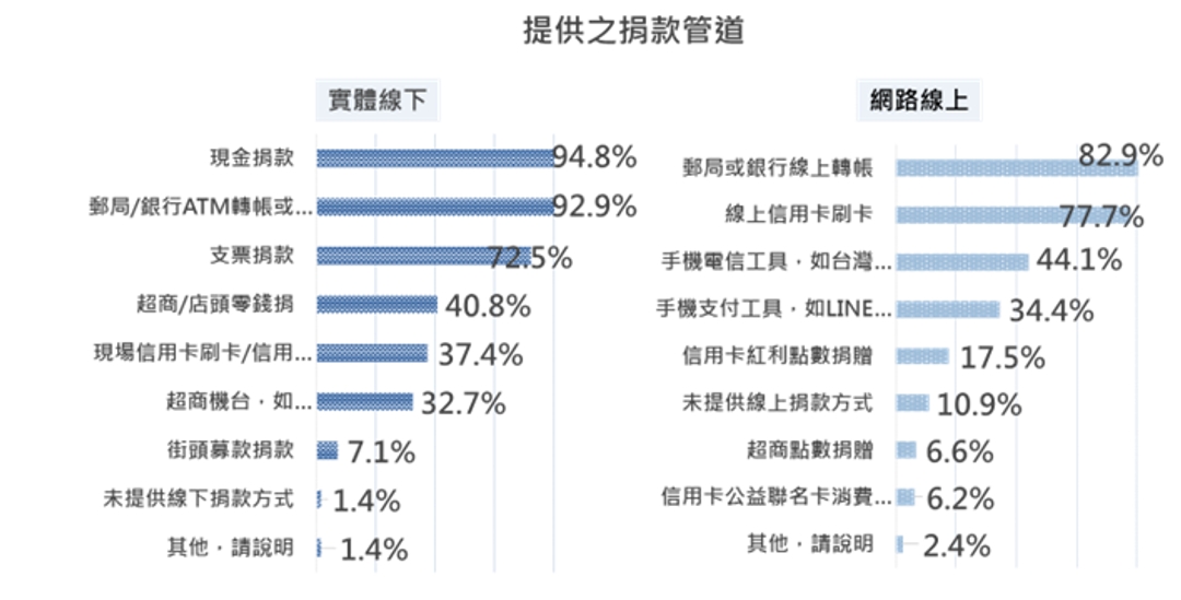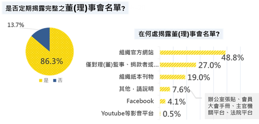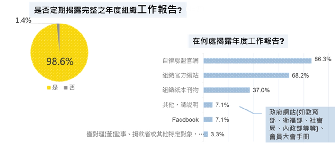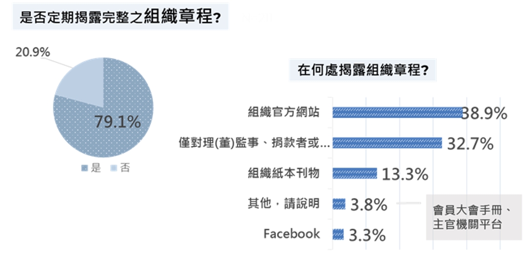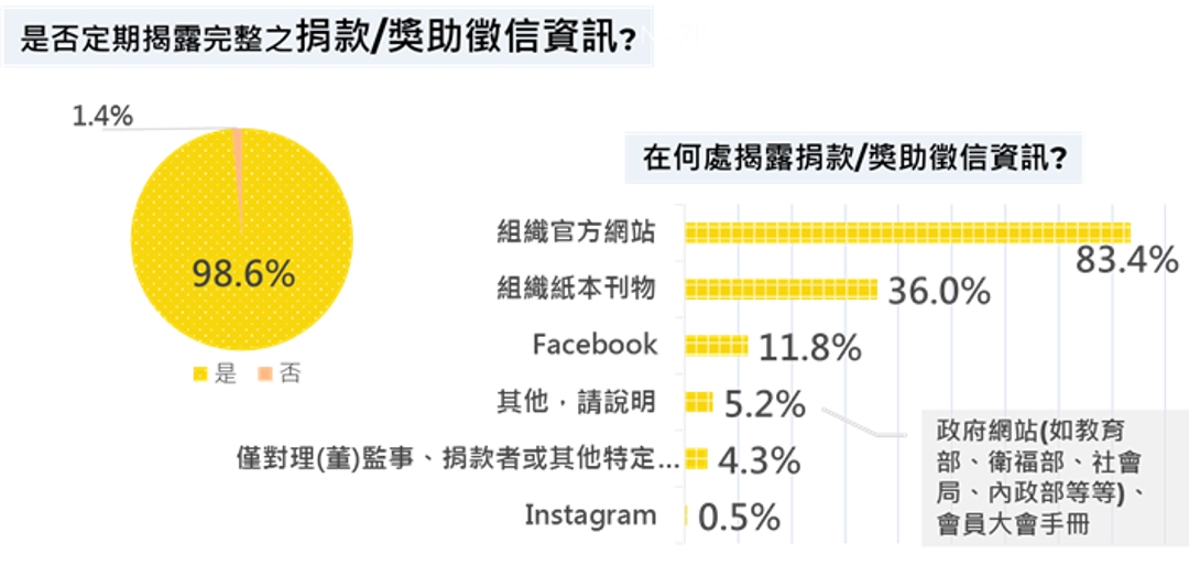 由上述數據可得知,非營利組織在年度財務報告、工作報告以及捐款/獎助徵信資訊上,定期揭露的比例超過98.5%、董(理)事名單達86.3%、組織章程也幾近8成,雖然揭露的程度不一,有完全公開者、也有針對特定他人以特定方式公開,仍可見本研究填答組 織資訊揭露的程度不低。然而根據「2020台灣民眾捐款行為及責信認知調查分析」調查結果,捐款人在責信認知的認同度高,也傾向捐款給責信度高的單位,但是在捐款前,透過組織財工報、捐款/獎助徵信資訊、董(理)事會名單、組織章程等資訊瞭解該組織是否具備責信力的比例卻不高。一方面可見捐款人認知及行為的不一致,其不一致可能來自於不知道作法、缺乏動機或是不得其門而入,另一方面則亦該重新檢視非營利組織在呈現各項資訊上的可讀性,以及資訊傳播的方式。