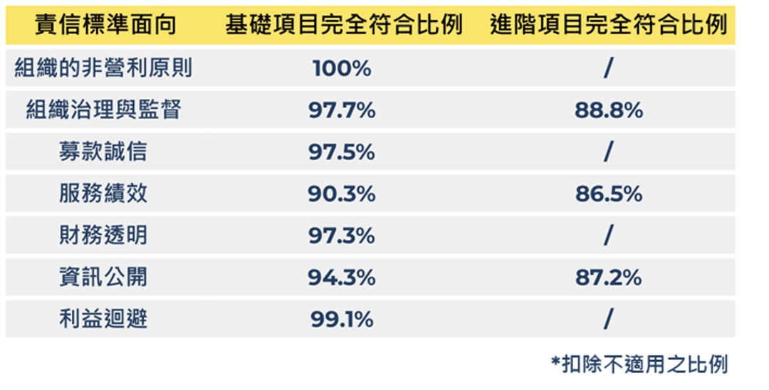 一、台灣非營利組織責信度自評:基礎項目完全符合比例超過9成