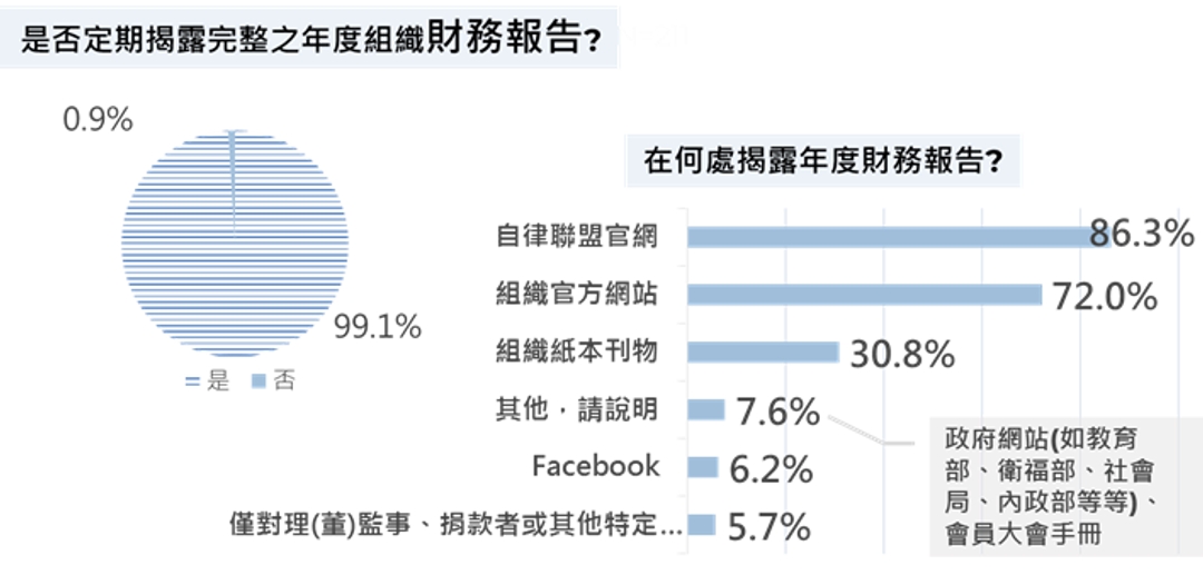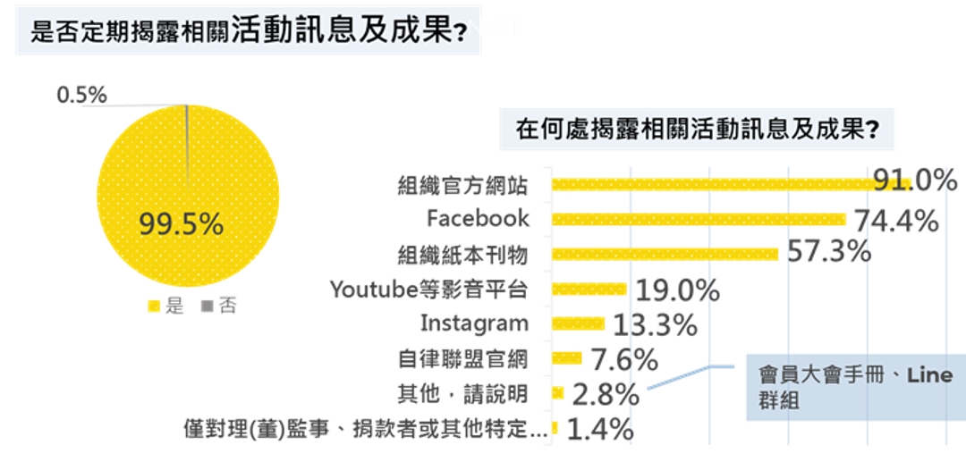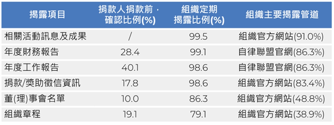 超過9成的組織定期揭露年度組織財務報告、工作報告、捐款/獎助徵信資訊,以及相關活動訊息及成果,其中財報及工報超過8成於自律聯盟官網揭露,其次為7成左右之組織官網;捐款/獎助徵信資訊多於組織官方網站揭露;相關活動訊息及成果,則多於官網(91%)、Facebook(74.4%)揭露。超過8成的組織定期揭露董(理)事會名單,最常見於組織官網揭露(48.8%),其次為僅對特定對象,以特定方式公開(27%)。近8成的組織定期揭露組織章程,最常見於組織官網揭露(38.9%)、以及僅對特定對象,以特定方式公開(38.9%)。非營利 組織最常見發布募款訊息的方式為透過非營利組織官方網站、臉書、Instagram或電子報等傳送,占8成6,其次為占6成的非營利組織媒體廣宣,如募款影片廣告、車廂平面廣告、紙本刊物、傳單等等。