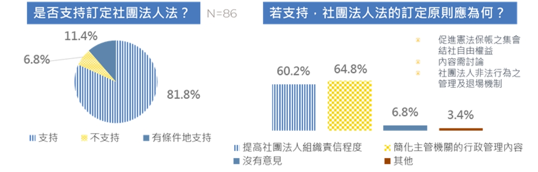 支持訂定社團法人法的的填答團體占多數,超過8成,有條件地支持者占1成,不支持者僅佔不到1成。整體而言,填答組織多數支持社團法人法的訂定。其中,超過6成5認為該法的訂定原則應簡化主管機關行政管理內容,亦有超過6成的組織認為應提高社團法人組織責信程度。