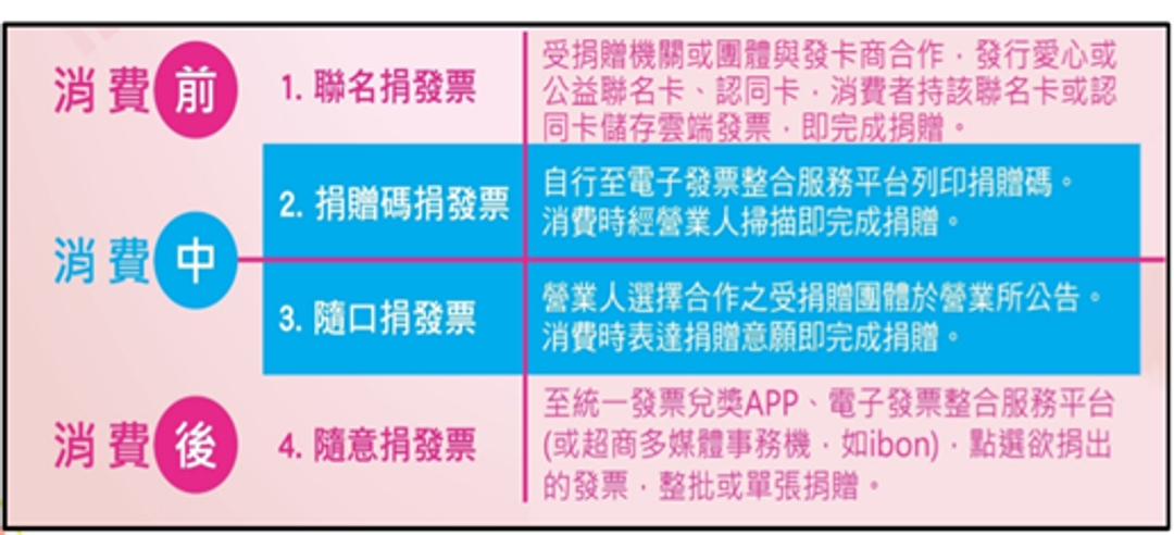考量到雲端發票所產生的不同捐贈情境,政府研發出不同的捐贈方式,在消費前、消費當下、以及完成消費後,都有機會捐贈雲端發票(如圖一)。