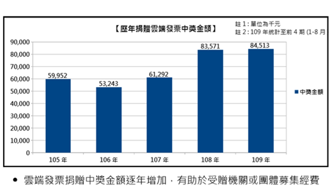 從統計數計來看,雲端發票有逐年增加捐贈張數的趨勢(圖二),而受捐贈團體中獎雲端發票的金額除了106年因中獎機率,導致金額比較低之外,每一年中獎金額也逐年提高(圖三),109年1-8月的捐贈雲端發票的中獎金額已達8千4百多萬,超越前一年總和。整體而言,申請捐增碼及受惠之公益團體逐年增加,根據財政部財政資訊中心的觀察,推行捐贈碼後,雲端發票捐贈張數逐年成長,募集金額也相對提高,受惠的公益團體也更普及;紙本電子發票則依循傳統發票捐贈方式,不影響公益團體發票募集。