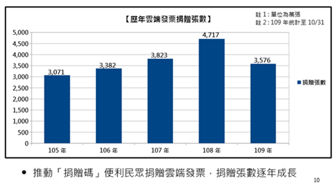 另外,跟大家分享我們雲端發票的募捐張數,今年預估到十二月底會有八十萬張,依過往每一期的比例去算,每一張可以換兩塊的中獎金額。